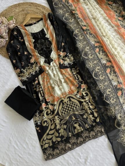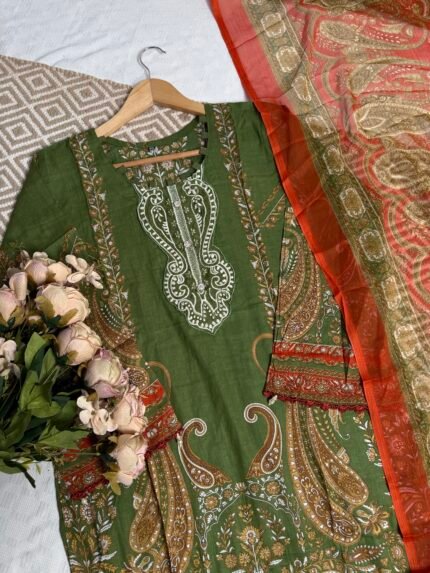 Unstitched Pakistani suit with cotton top and bottom, paired with a soft chiffon dupatta for an elegant finish.