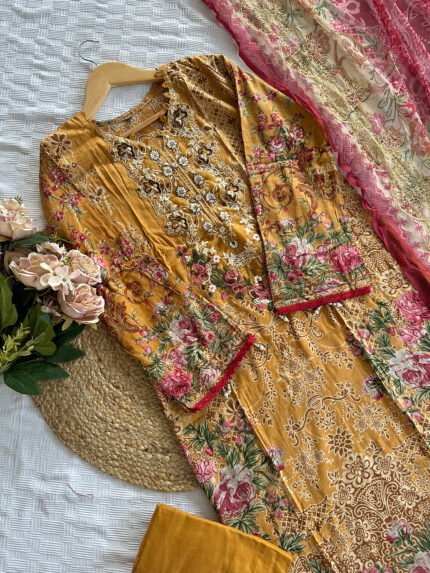Unstitched Pakistani suit with cotton top and bottom, paired with a soft chiffon dupatta for an elegant finish.