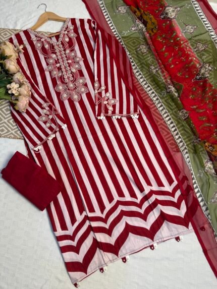 Stylish readymade Pakistani suit featuring a soft cotton top and bottom, paired with an elegant chiffon dupatta — perfect for casual wear and small occasions.