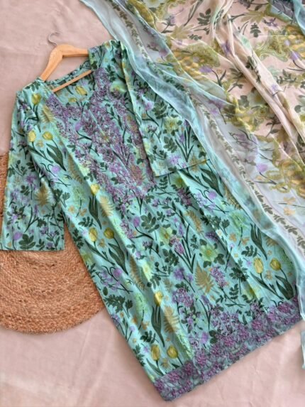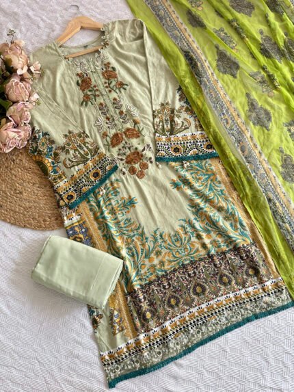 Unstitched Pakistani suit with cotton top and bottom, paired with a soft chiffon dupatta for an elegant finish.