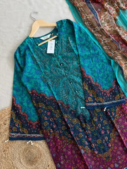 Ready made Heavy embroidery cotton top and bottom with chiffon dupatta
