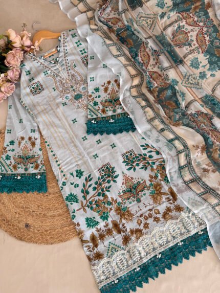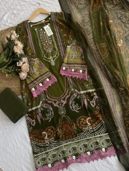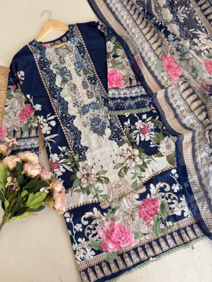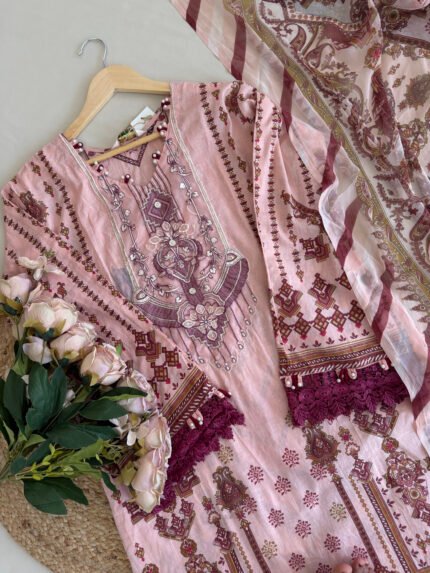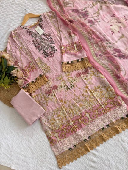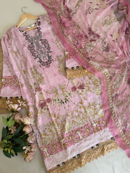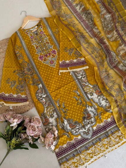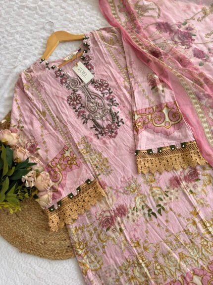 Stylish readymade Pakistani suit featuring a soft cotton top and bottom, paired with an elegant chiffon dupatta — perfect for casual wear and small occasions.