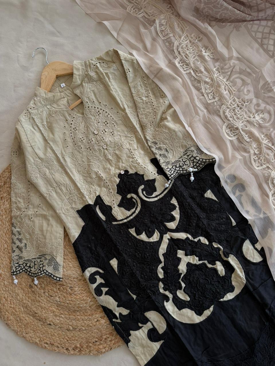 Unstitched stitched heavy embroidery cotton top and bottom with chiffon dupatta.