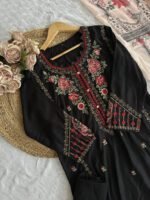 Unstitched embroidered Pakistani suit with cotton top and bottom, paired with a soft chiffon dupatta for an elegant finish.