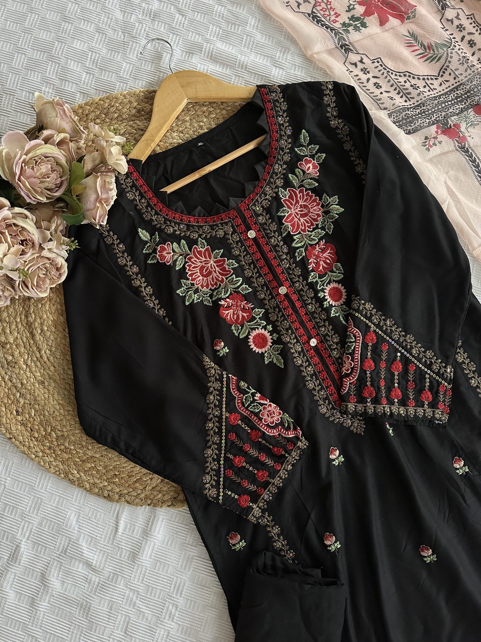 This set features a cotton top and bottom paired with a lightweight chiffon dupatta. Unstitched, it can be tailored to your preferred style.
