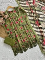 Unstitched embroidered Pakistani suit with cotton top and bottom, paired with a soft chiffon/cotton dupatta for an elegant finish.