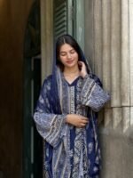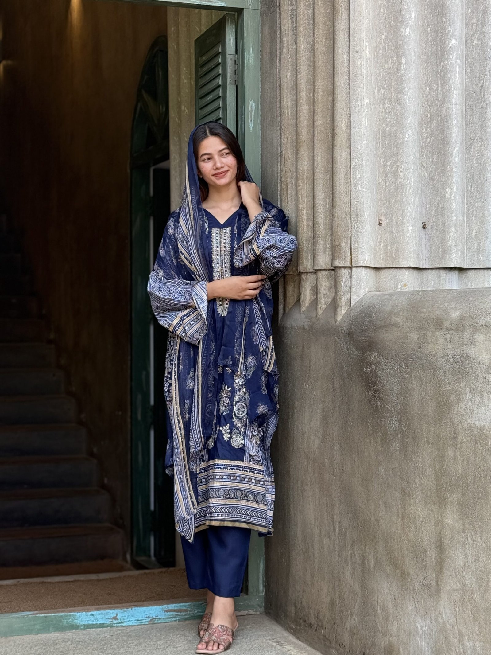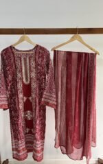 This set features a cotton top and bottom paired with a lightweight chiffon dupatta. Unstitched, it can be tailored to your preferred style.