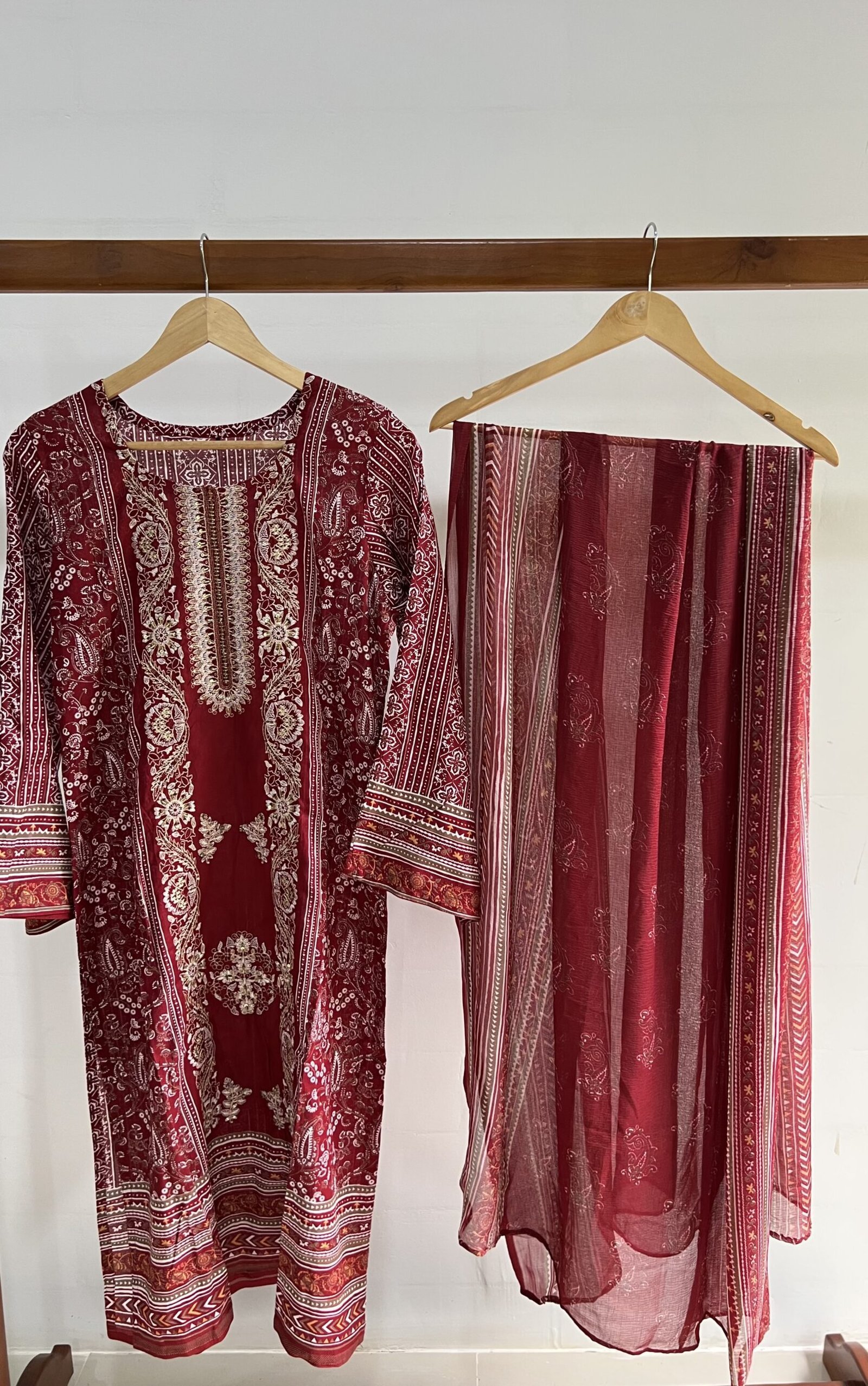 Unstitched Pakistani suit with cotton top and bottom, paired with a soft chiffon dupatta for an elegant finish.