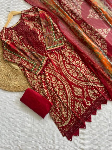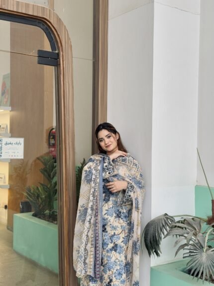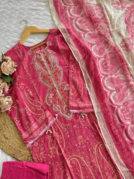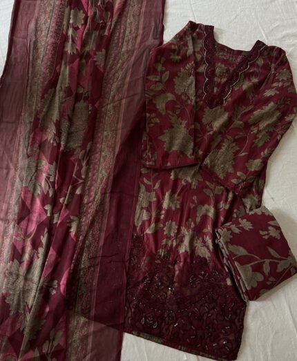 Unstitched Pakistani suit with cotton top and bottom, paired with a soft chiffon/cotton  dupatta for an elegant finish.