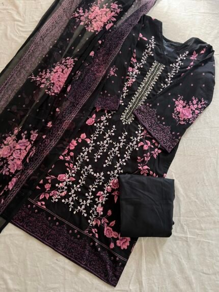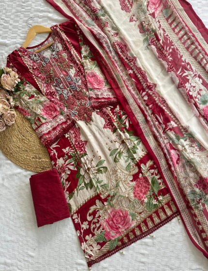 Unstitched embroidered Pakistani suit with cotton top and bottom, paired with a soft chiffon dupatta for an elegant finish.