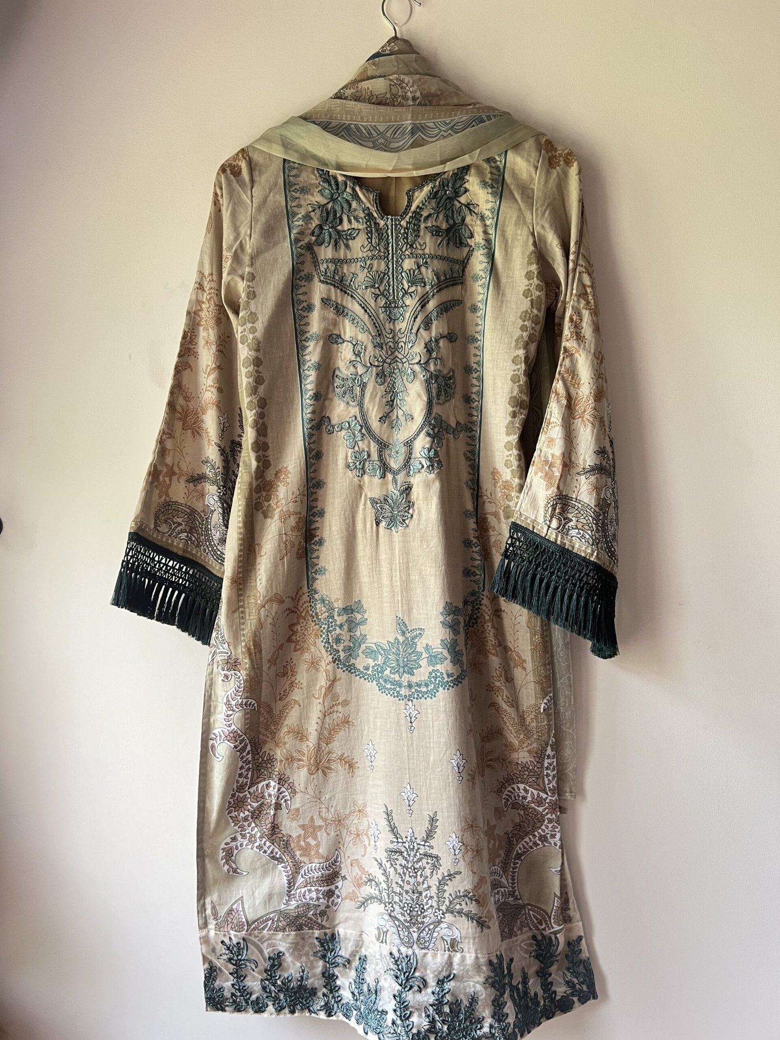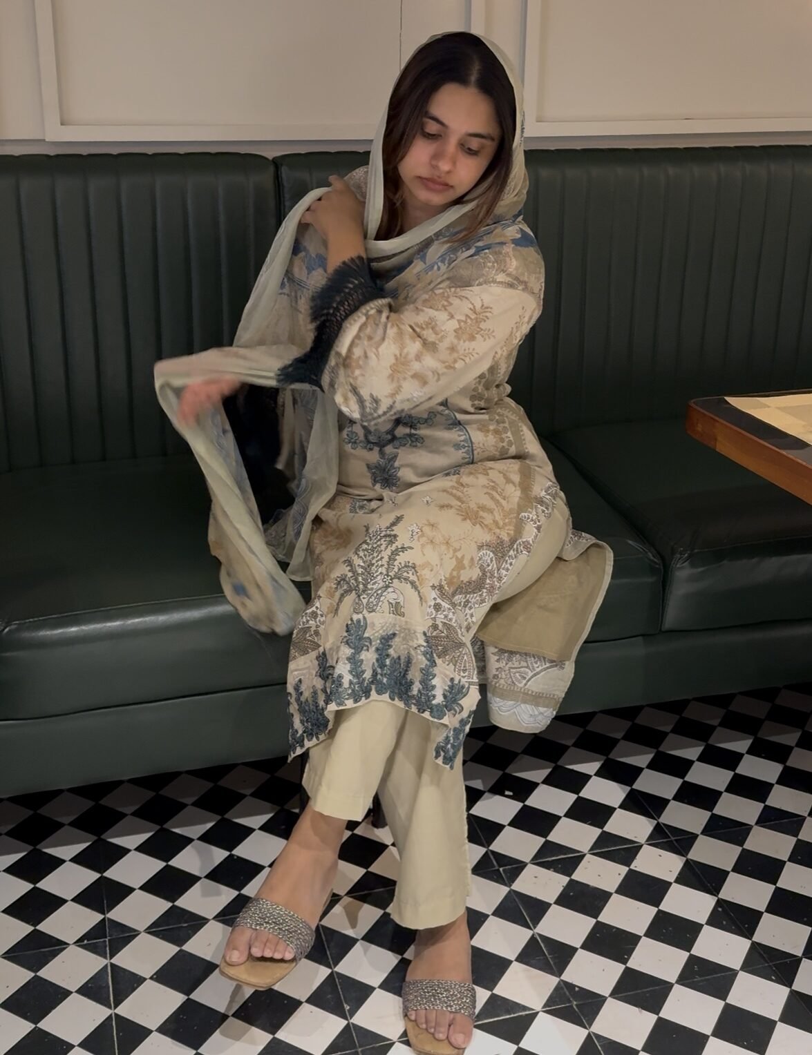 Stylish readymade Pakistani suit featuring a soft cotton top and bottom, paired with an elegant chiffon dupatta — perfect for casual wear and small occasions.