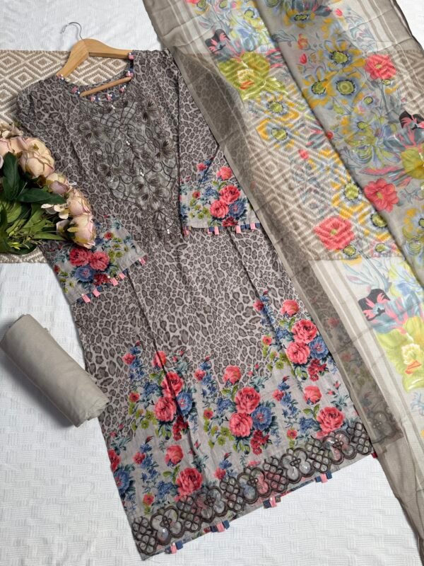 Unstitched Pakistani suit with cotton top and bottom, paired with a soft chiffon dupatta for an elegant finish.