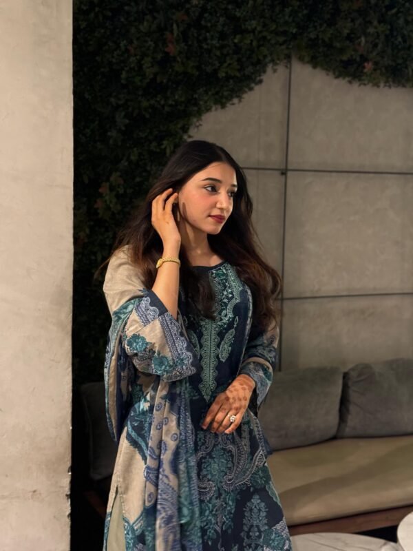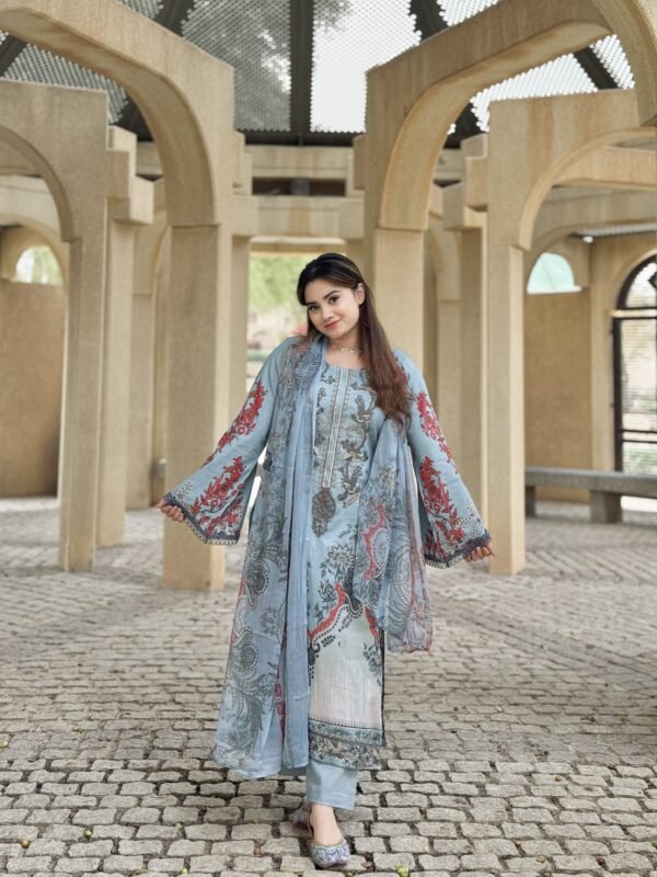 Semistitched embroidered Pakistani suit withrayontop and bottom, paired with a soft chiffon dupatta for an elegant finish