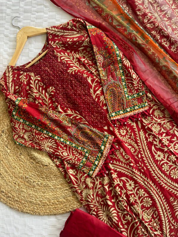 Readymade Pakistani cotton suit with chiffon dupatta.