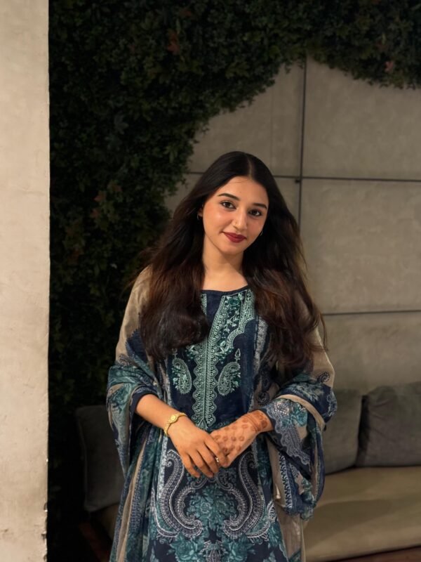 Unstitched Pakistani suit with cotton top and bottom, paired with a soft chiffon dupatta for an elegant finish.