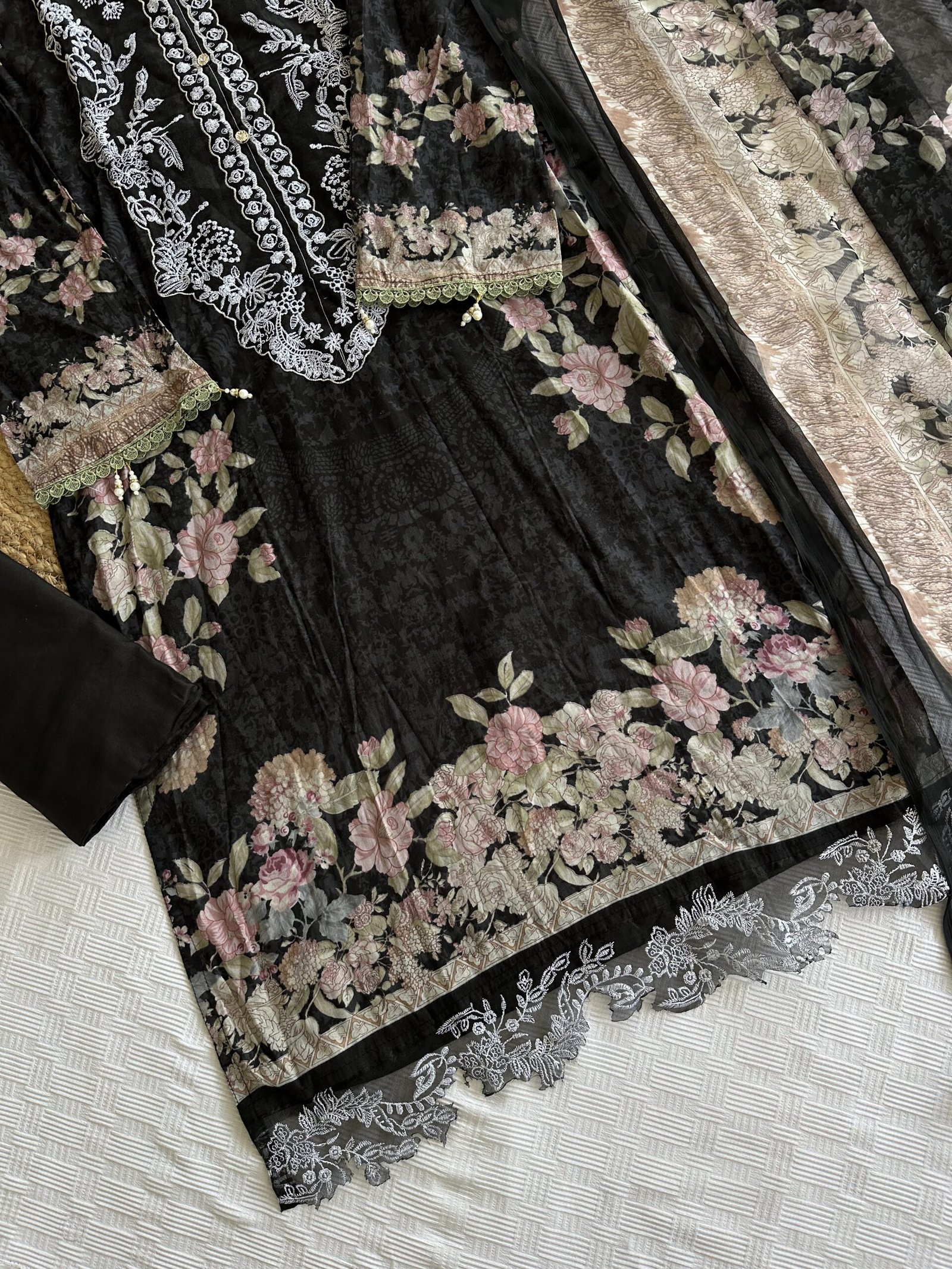 This set features a cotton top and bottom paired with a lightweight chiffon/cotton dupatta.