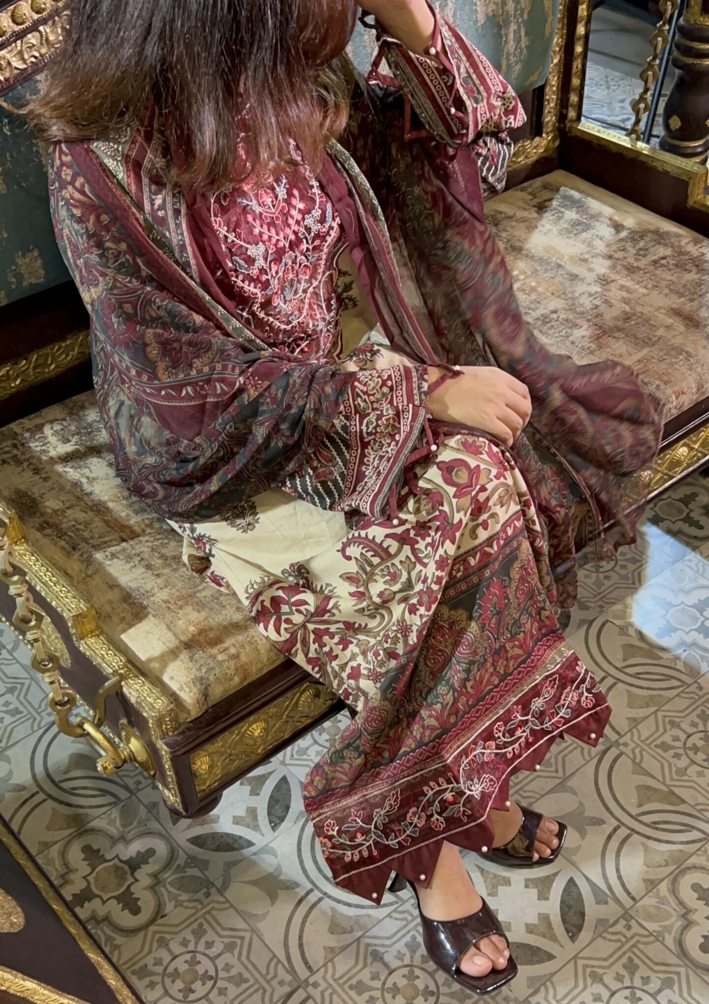 Unstitched Pakistani suit with cotton top and bottom, paired with a soft chiffon/cotton dupatta for an elegant finish.