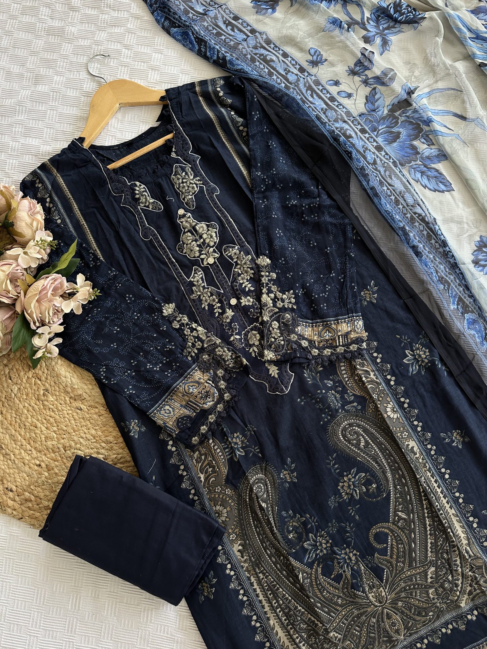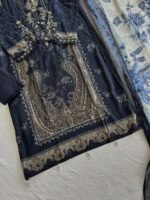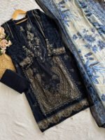Unstitched embroidered Pakistani suit with cotton top and bottom, paired with a soft chiffon/cotton dupatta for an elegant finish.