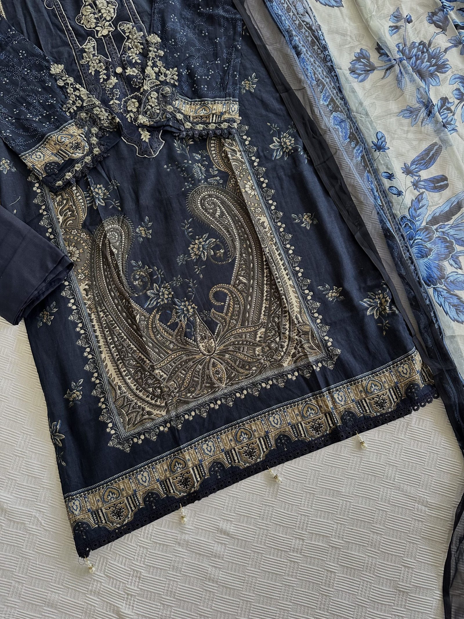 Unstitched Pakistani suit with cotton top and bottom, paired with a soft chiffon/cotton  dupatta for an elegant finish.
