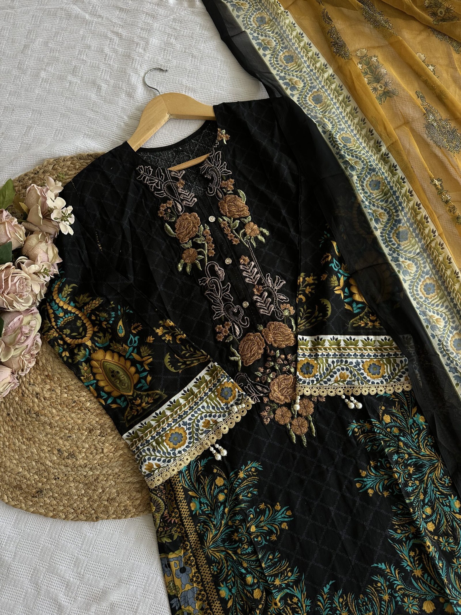 This set features a cotton top and bottom paired with a lightweight chiffon/cotton dupatta.