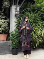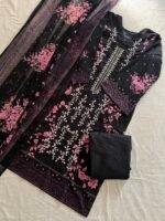 Unstitched Pakistani suit with cotton top and bottom, paired with a soft chiffon dupatta for an elegant finish.