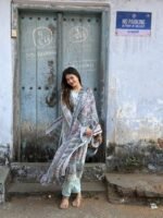 Unstitched Pakistani suit with cotton top and bottom, paired with a soft chiffon dupatta for an elegant finish.