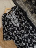 This set features a cotton top and bottom paired with a lightweight chiffon dupatta. Unstitched, it can be tailored to your preferred style. (made on order)