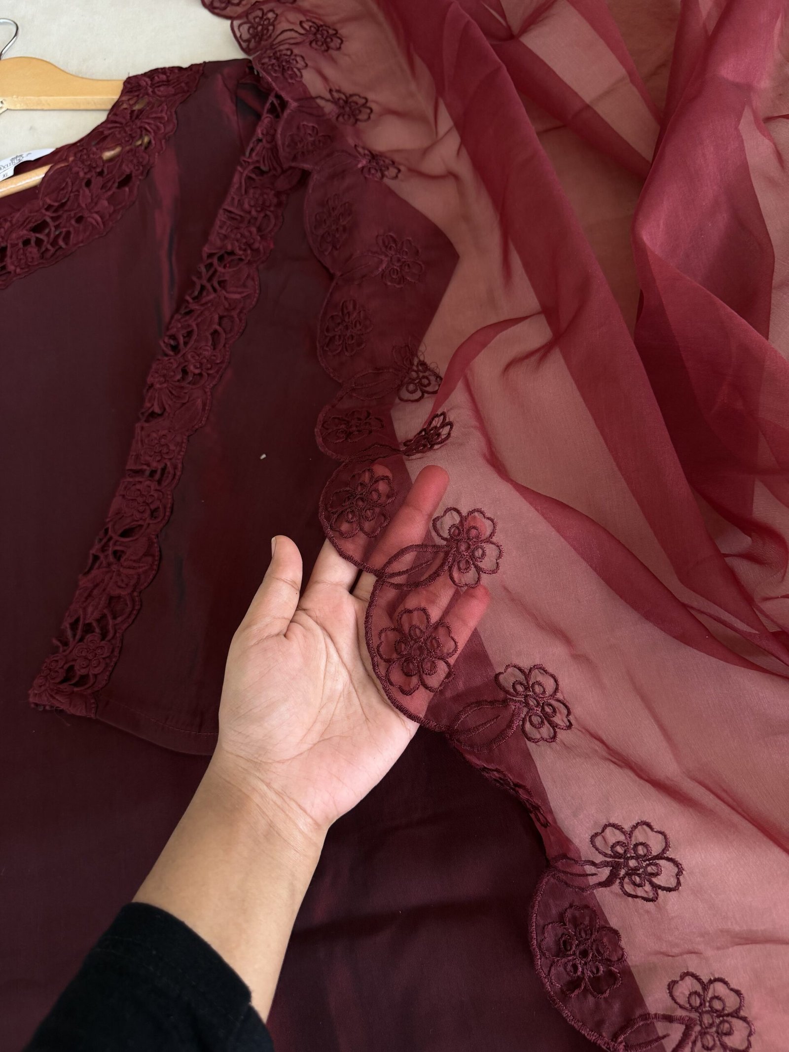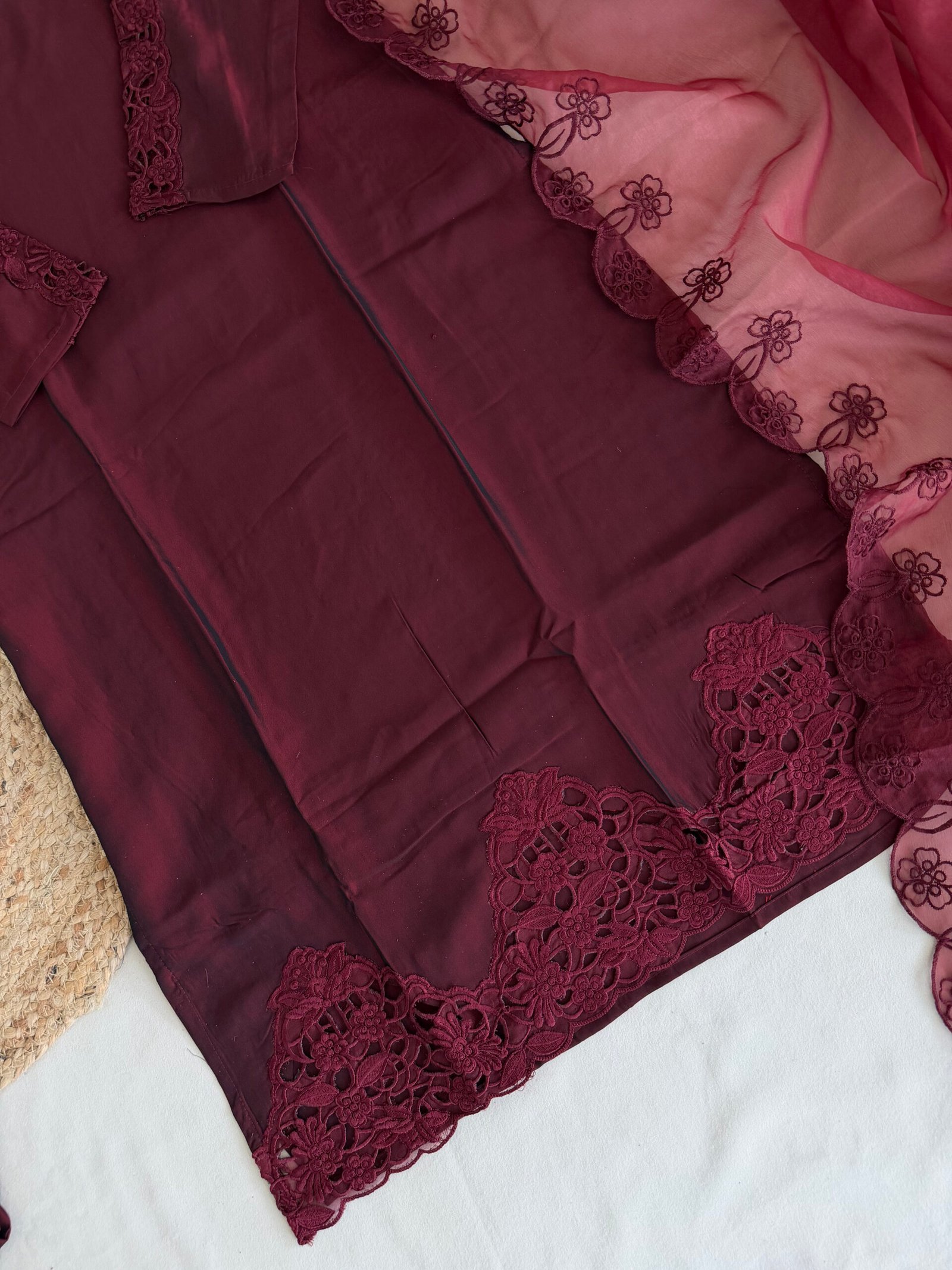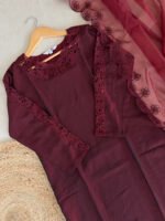 This elegant Pakistani suit features a soft silk top and bottom, designed for effortless comfort and refined style. It is beautifully complemented with a lightweight organza dupatta, adding a soft, graceful finish. Ideal for both festive occasions and elegant gatherings.