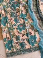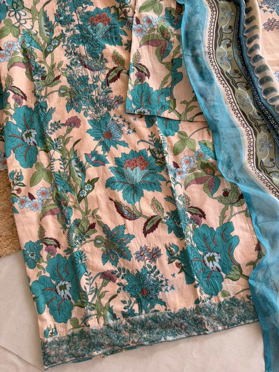 Unstitched Pakistani suit with cotton top and bottom, paired with a soft chiffon dupatta for an elegant finish.
