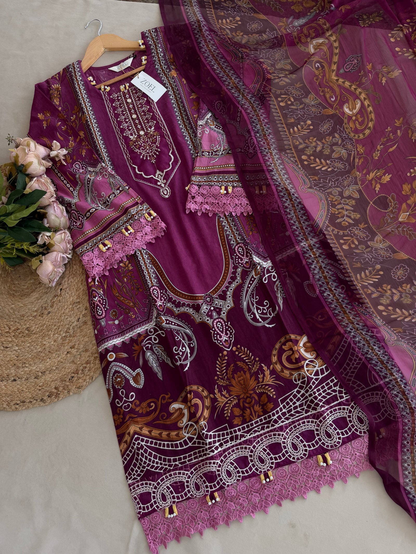 Unstitched Pakistani suit with cotton top and bottom, paired with a soft chiffon dupatta for an elegant finish