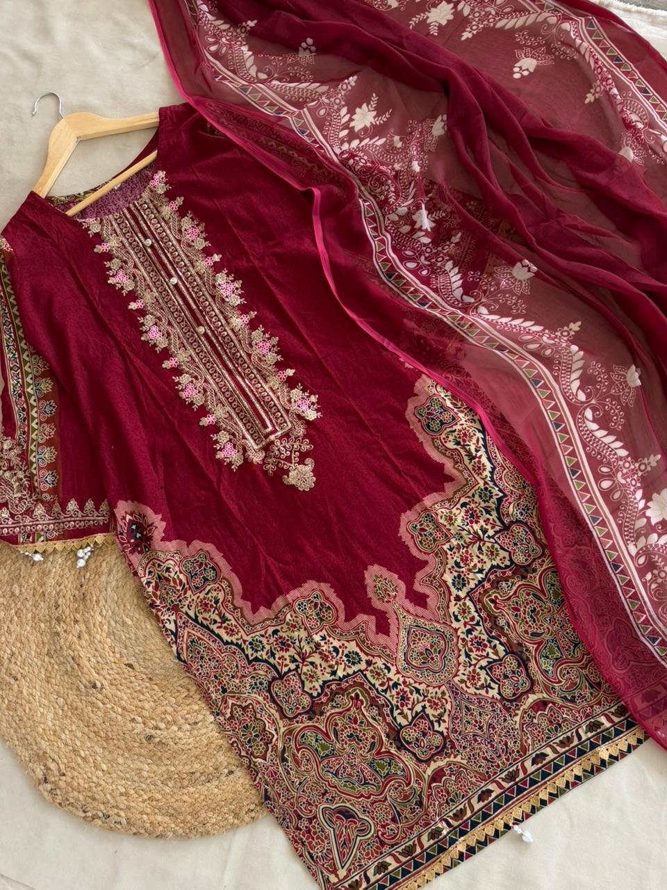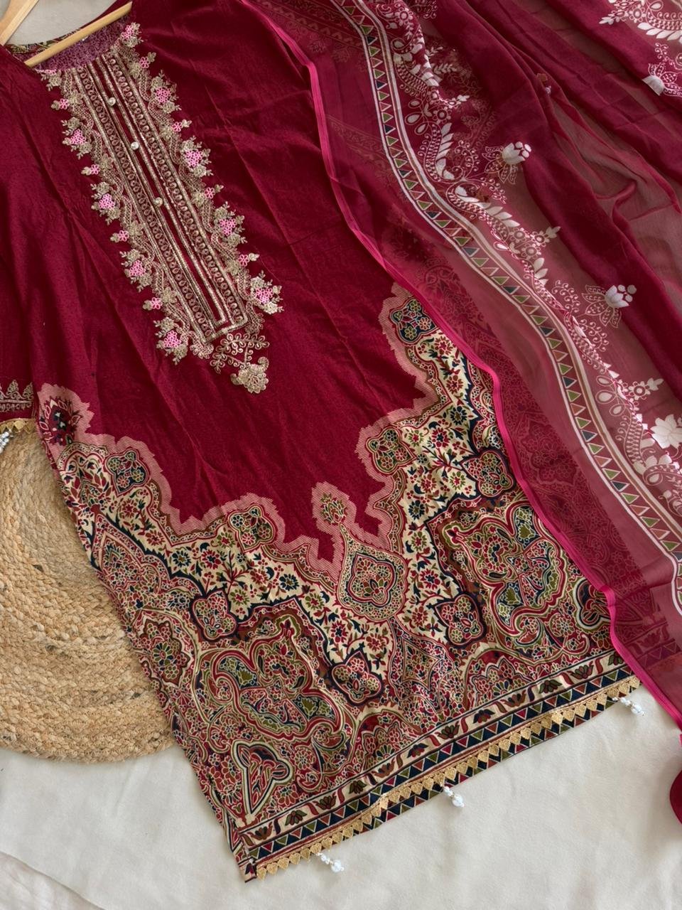 Stylish readymade Pakistani suit featuring a soft cotton top and bottom, paired with an elegant chiffon dupatta — perfect for casual wear and small occasions (made on order)