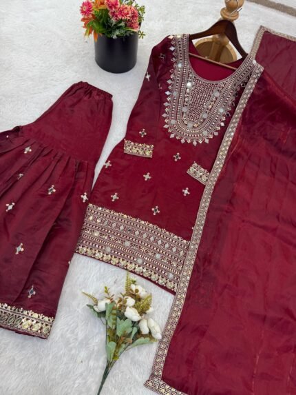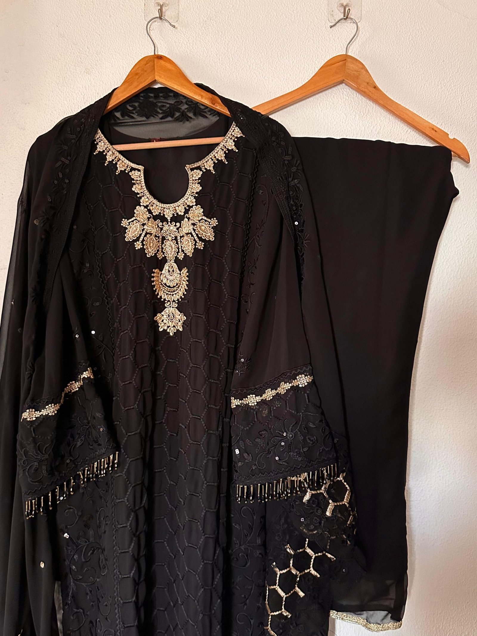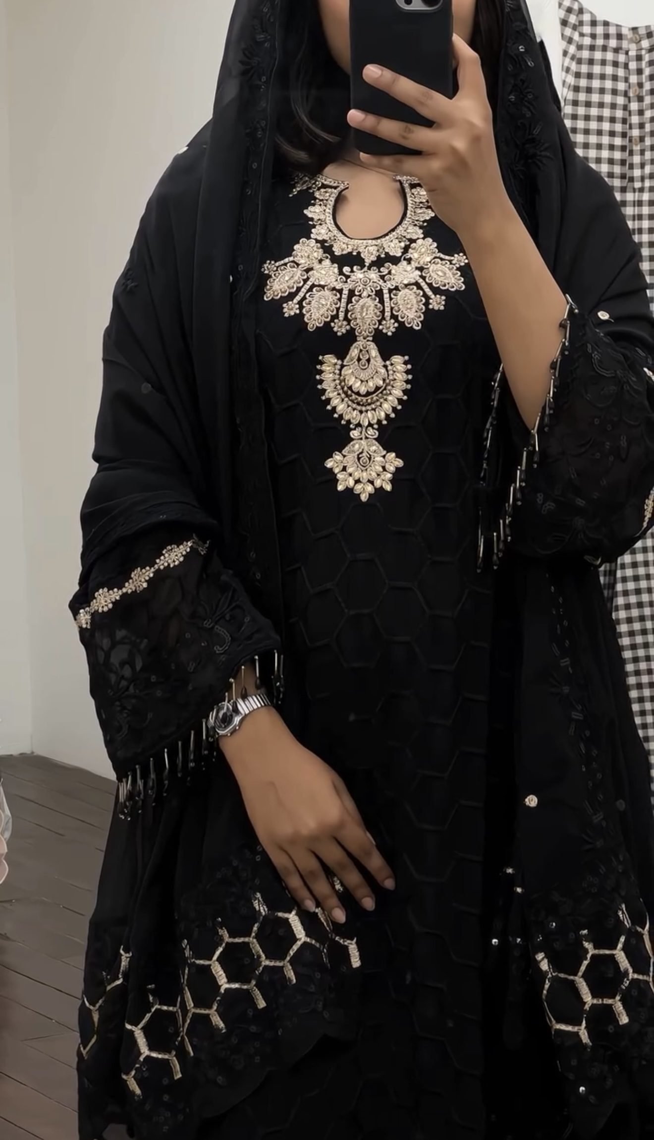 Partywear suit, adorned with dazzling sequin work, fancy tassels and a stunning cutwork dupatta.