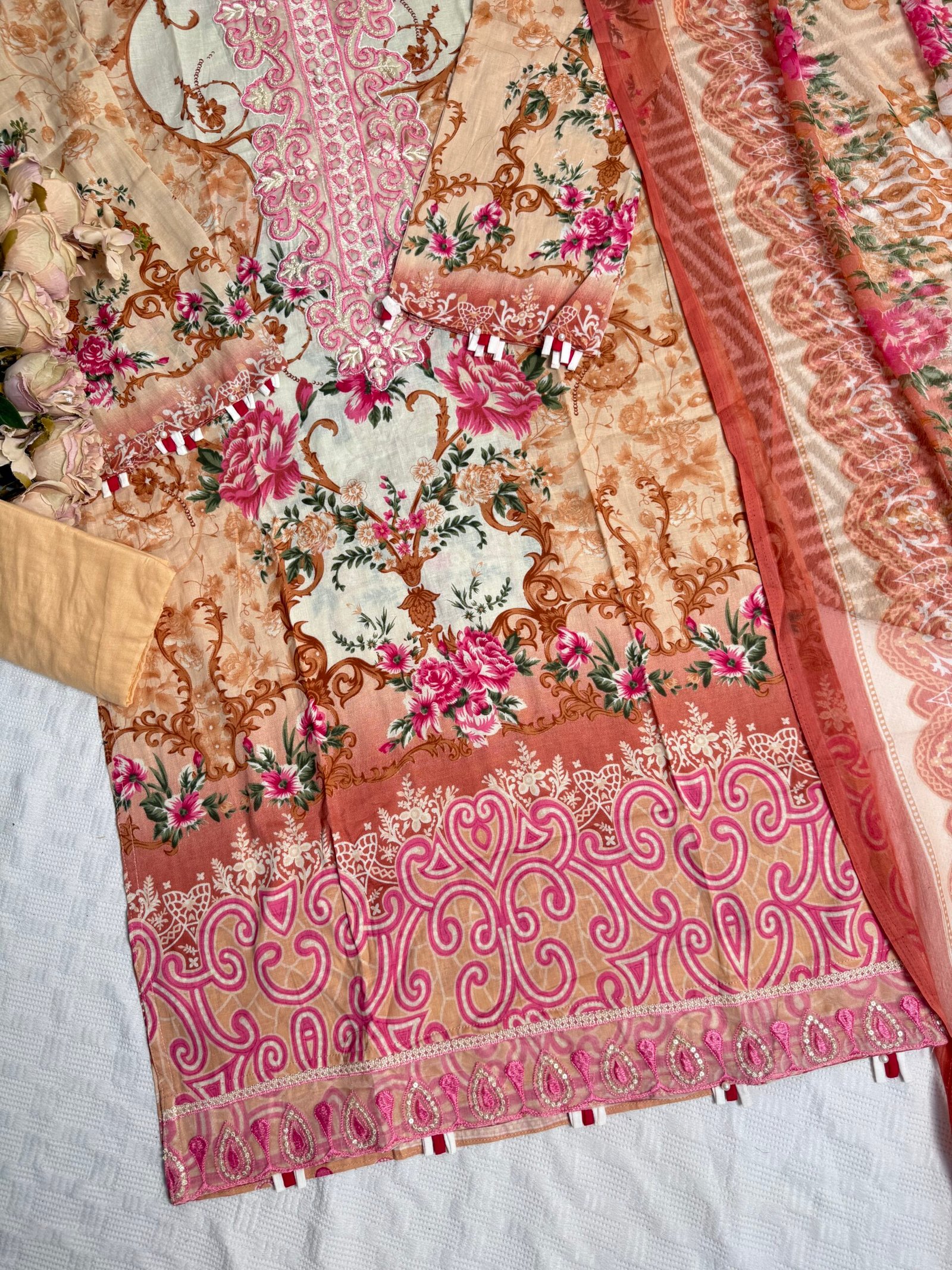 Readymade Pakistani cotton suit with chiffon dupatta.