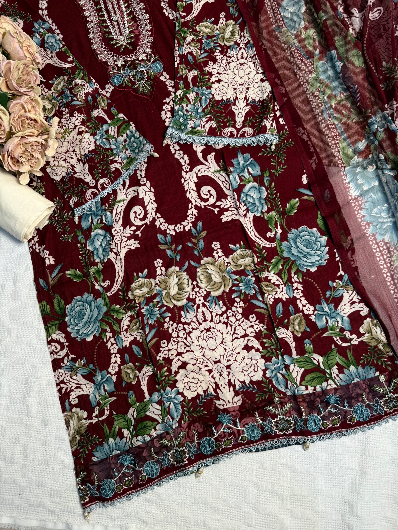 Readymade Pakistani cotton suit with chiffon dupatta.