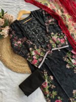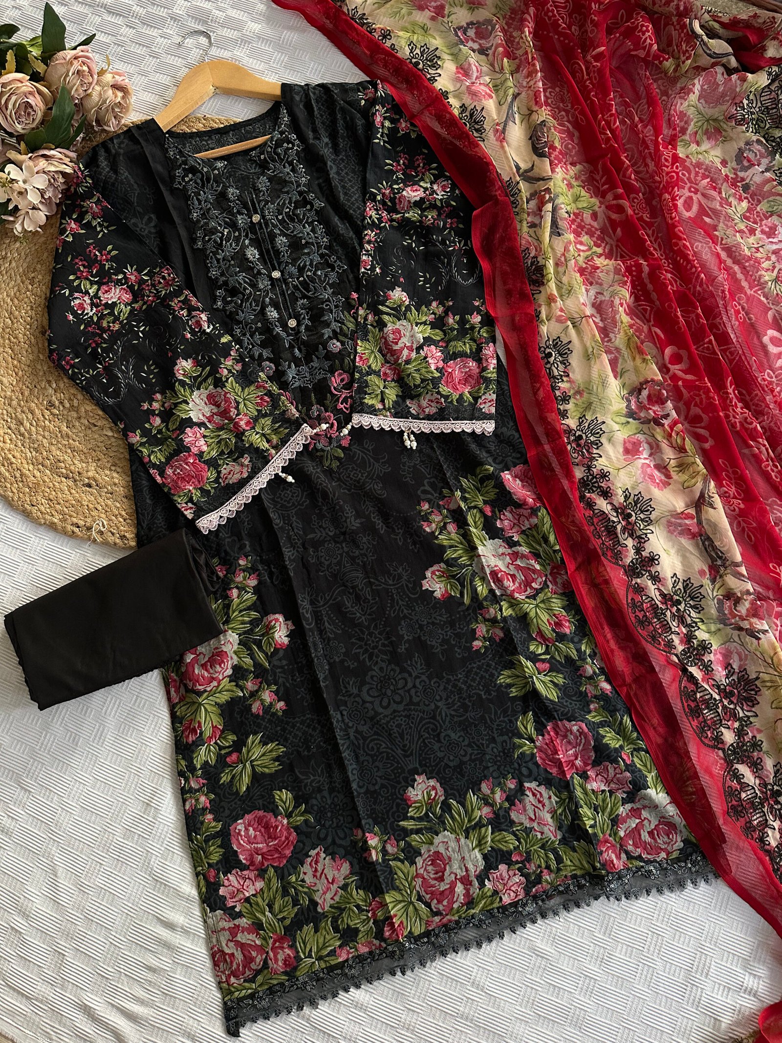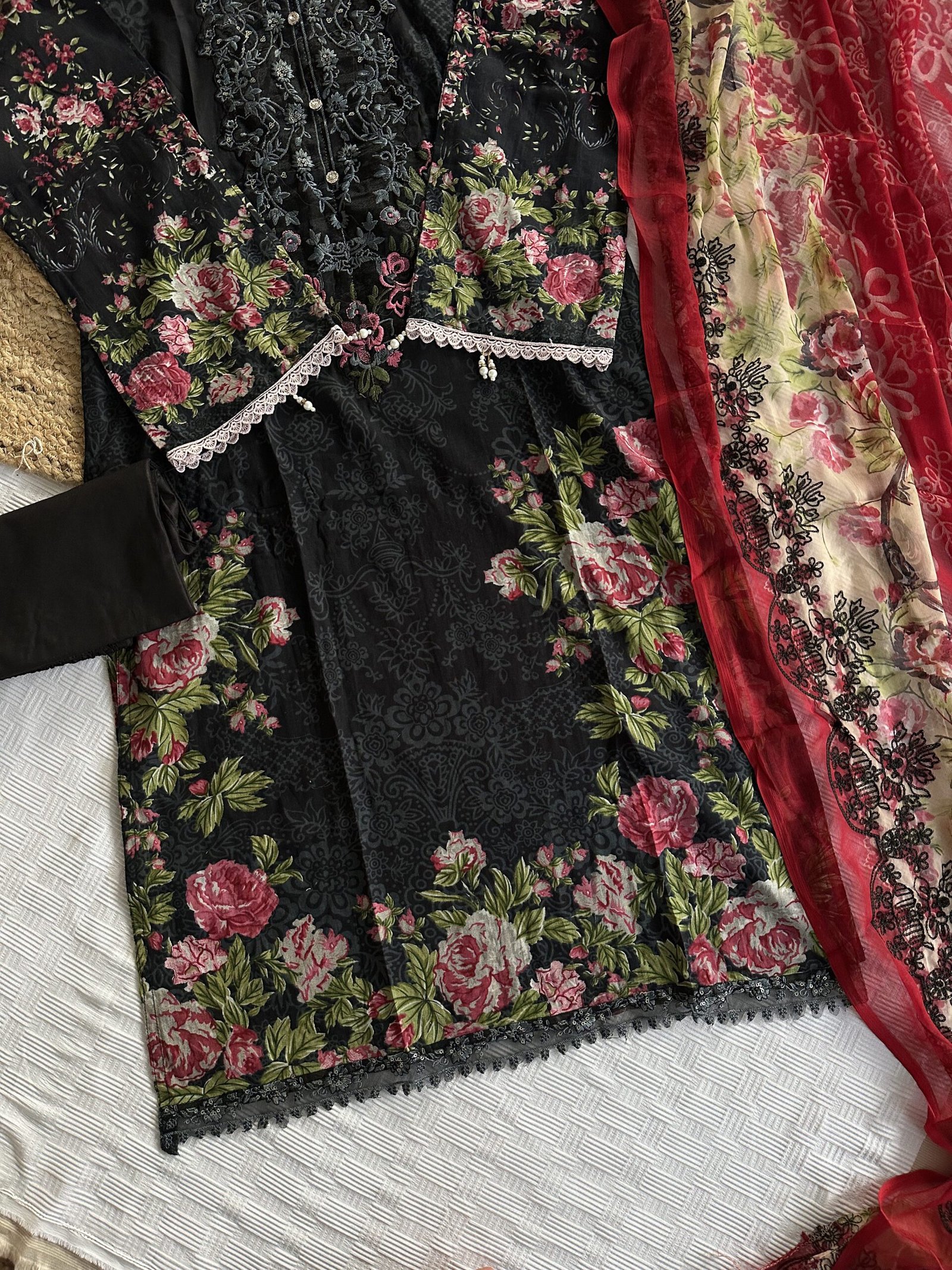 Readymade Pakistani cotton suit with embroidered chiffon dupatta.