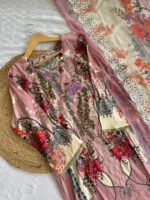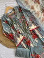 Readymade free size Pakistani cotton suit with embroidered chiffon dupatta.