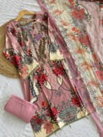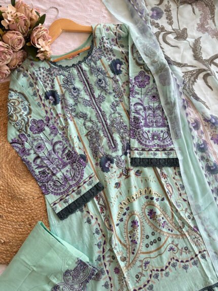 Stylish readymade Pakistani suit featuring a soft cotton top and bottom, paired with an elegant embroidered chiffon dupatta — perfect for casual wear and small occasions.