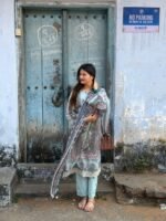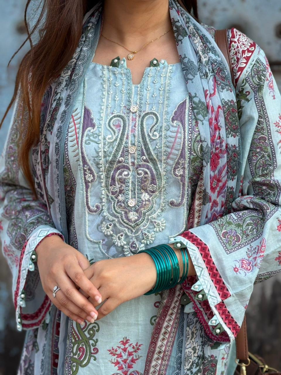 Readymade Pakistani cotton suit with chiffon dupatta.
