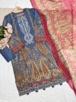 Stylish readymade Pakistani suit featuring a soft cotton top and bottom, paired with an elegant chiffon dupatta — perfect for casual wear and small occasions.
