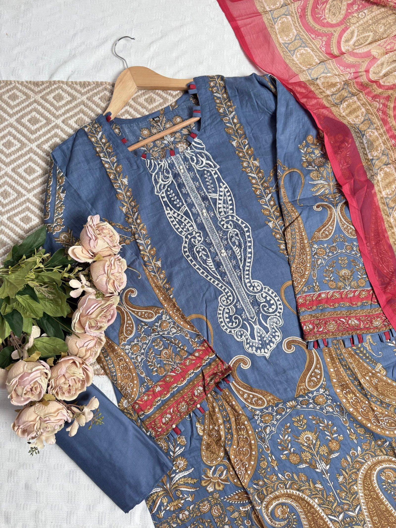 Readymade Pakistani cotton suit with chiffon dupatta.