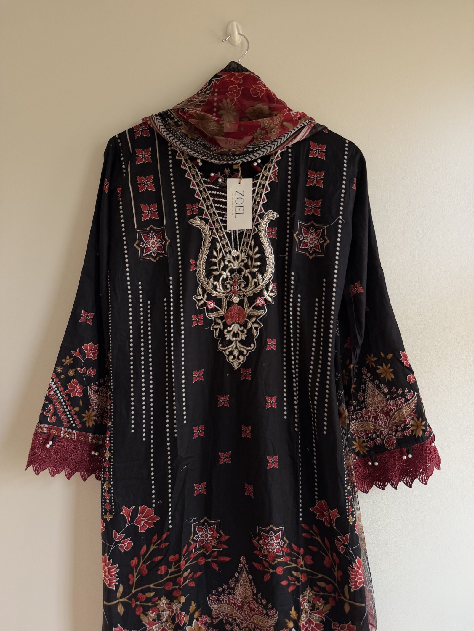 Readymade Pakistani cotton suit with chiffon dupatta.