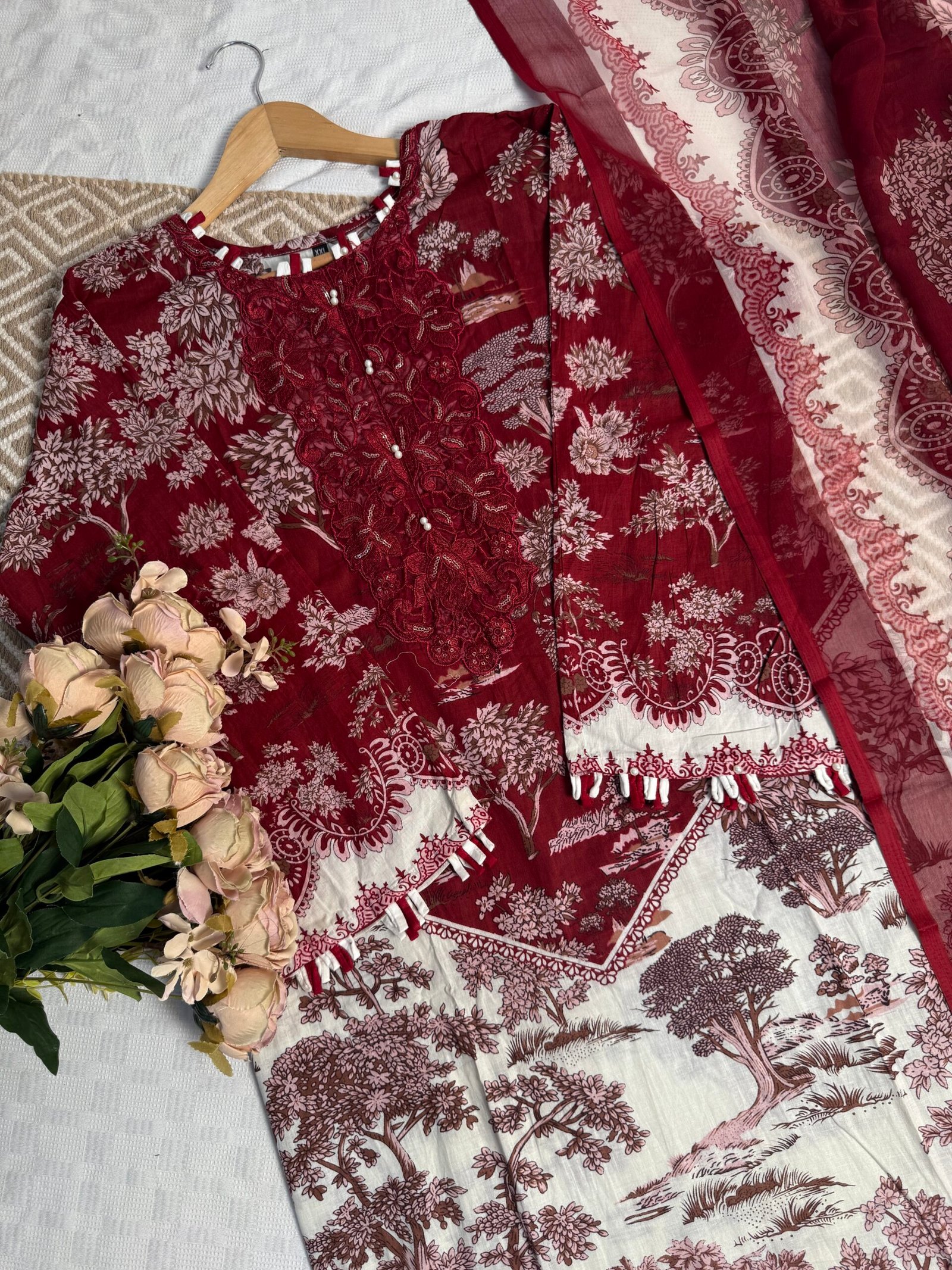 Readymade free size Pakistani cotton suit with chiffon dupatta.