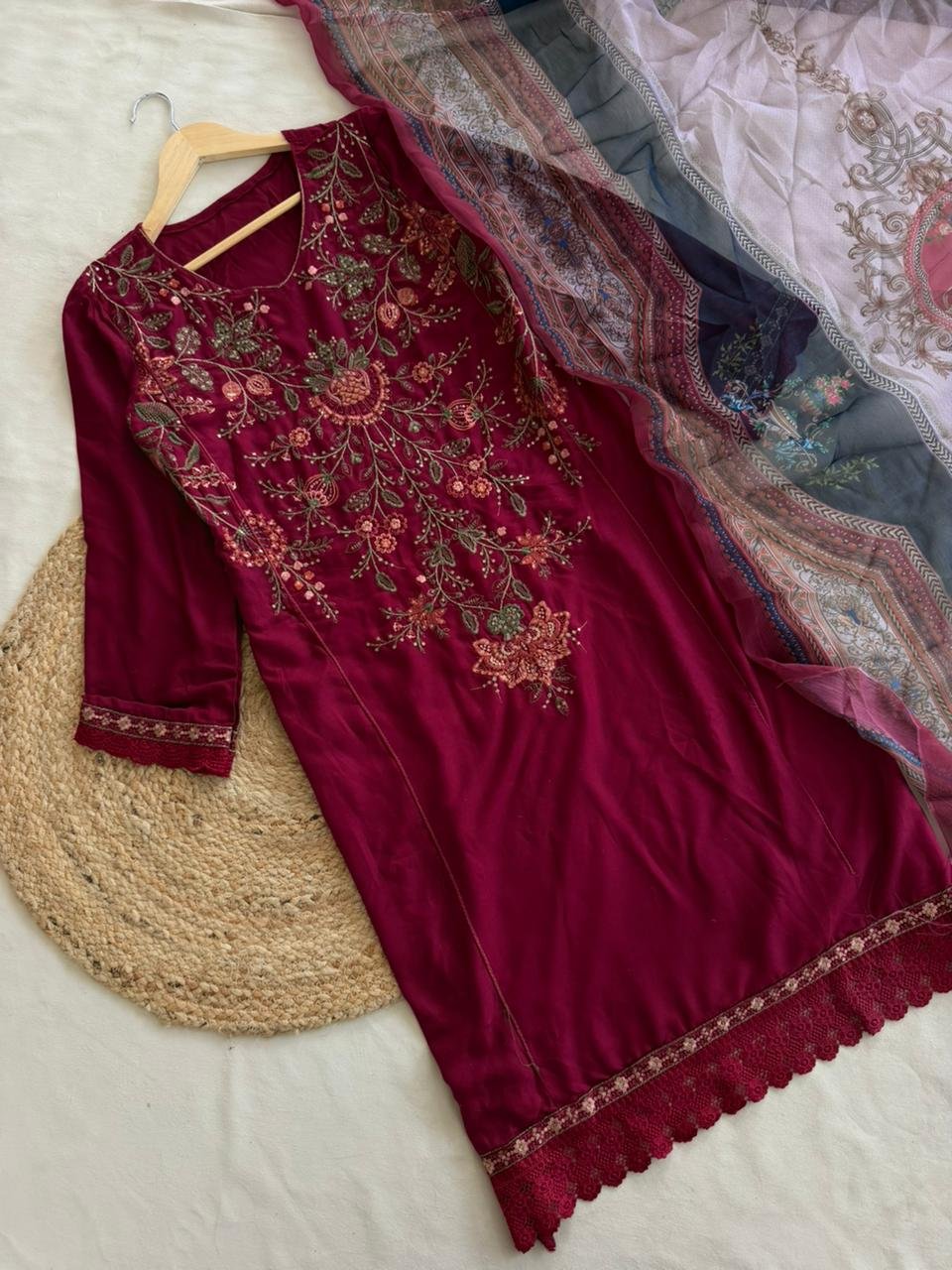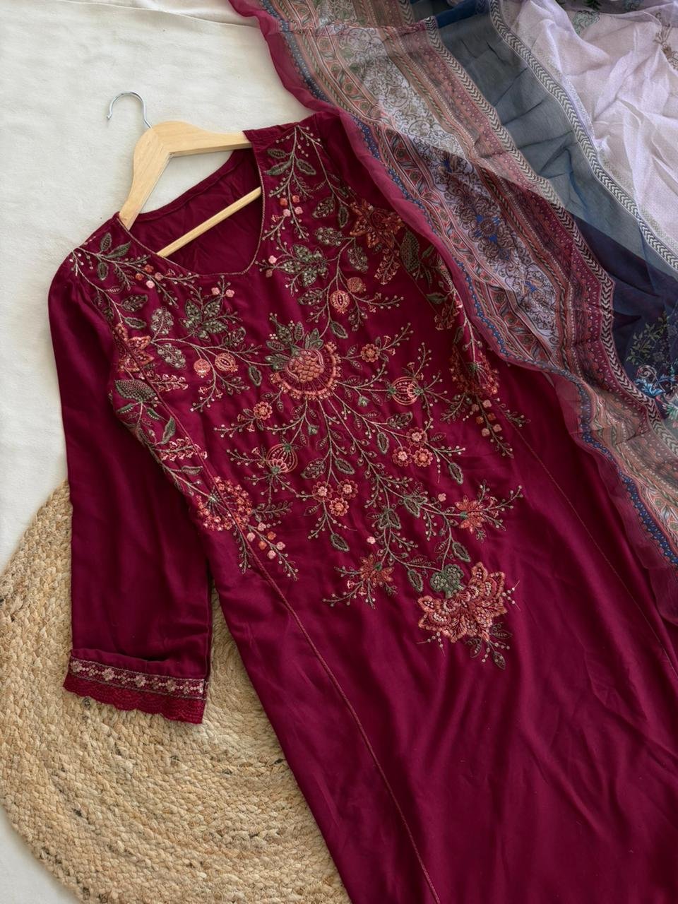 Semi-stitched rayon suit with an embroidered top, comfortable rayon bottom, and flowy chiffon dupatta—perfect for and festive wear.