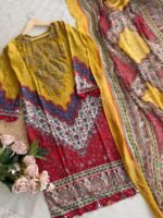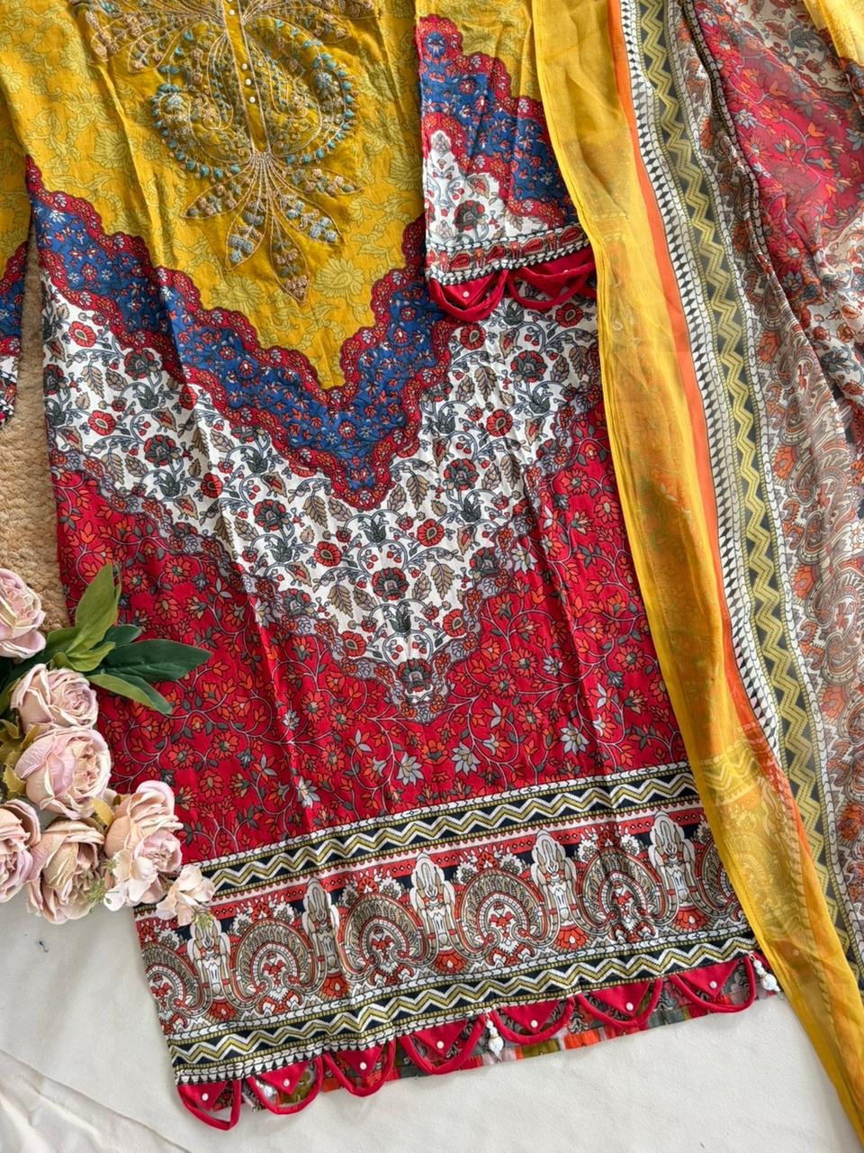 Unstitched Pakistani suit with cotton top and bottom, paired with a soft chiffon dupatta for an elegant finish.