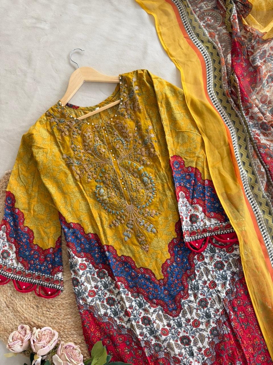 This set features a cotton top and bottom paired with a lightweight chiffon dupatta. Unstitched, it can be tailored to your preferred style.